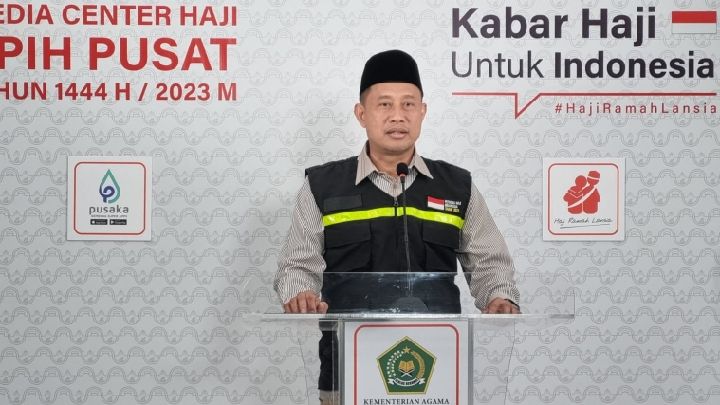 Juru Bicara PPIH Pusat, Akhmad Fauzin saat menggelar keterangan pers di Media Center Haji (MCH) Asrama Haji Pondok Gede, Jakarta, Rabu 5 Juli 2023.
