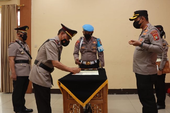 Kapolres Metro Tangerang Kota Kombes Zain Dwi Nugroho memimpin upacara sertijab lima perwira di Aula Mapolres Tangerang Kota, Kamis (10/11/2022).
