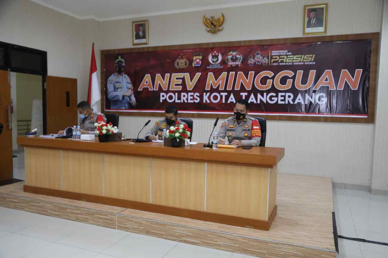 KABUPATEN TANGERANG – Kapolresta Tangerang Kombes Wahyu Sri Bintoro memimpin pelaksanaan Analisa dan Evaluasi (Anev) Kinerja Mingguan jajaran Polresta Tangerang Polda Banten. Anev dilaksanakan di Rupatama Polresta Tangerang, Senin (15/3/2021).