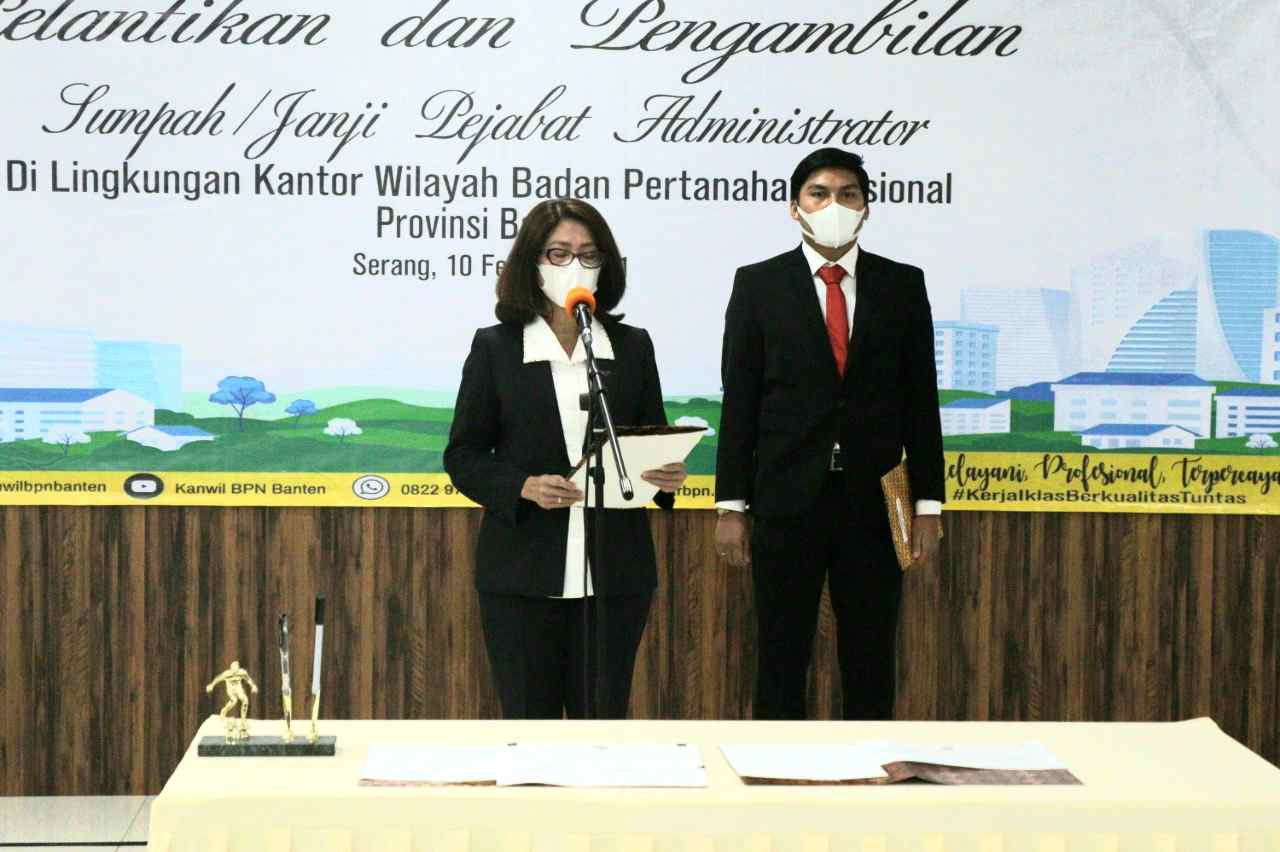 SERANG – Kepala Kantor Wilayah Badan Pertanahan Nasional (BPN) Provinsi Banten, Andi Tenri Abeng resmi melantik tiga orang Pejabat Administrator di Aula Baduy Utama Kantor Wilayah BPN Provinsi Banten, Rabu (10/2/2021).