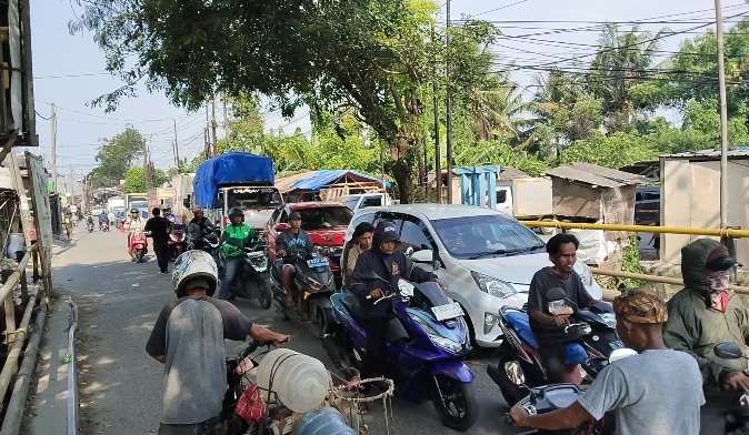 Pantauan Pikiran Rakyat Tangerang menunjukkan antrean panjang mengular dari arah Jalan Teluknaga mulai dari Polsek Teluknaga menuju jembatan. Sebaliknya, dari arah Pakuhaji, kendaraan terjebak macet dari kawasan BLP hingga jembatan.