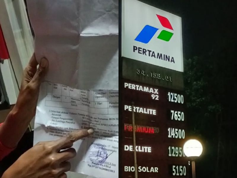 Petugas SPBU menunjukkan surat berstempel kelurahan dari pembeli pertalite. (Foto: kollase/infotangerang.co.id)