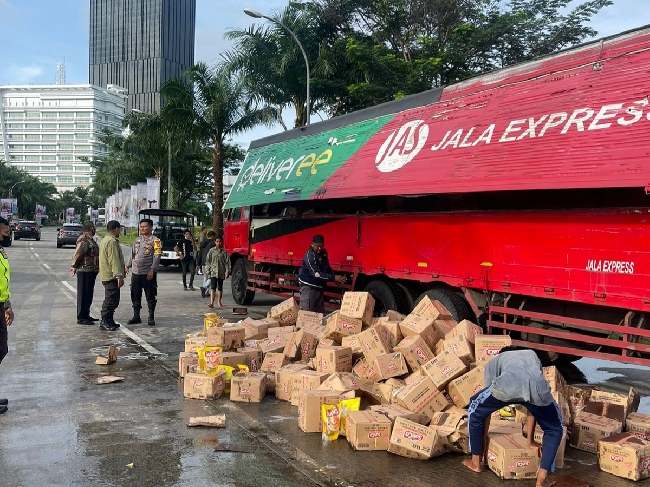 KOTA TANGERANG – Truk bermuatan minyak goreng bermerek Sunco tumpah berserakan di Jalan Jalur Sutera, Kelurahan Kunciran, Kota Tangerang, Jumat (18/11/2022).