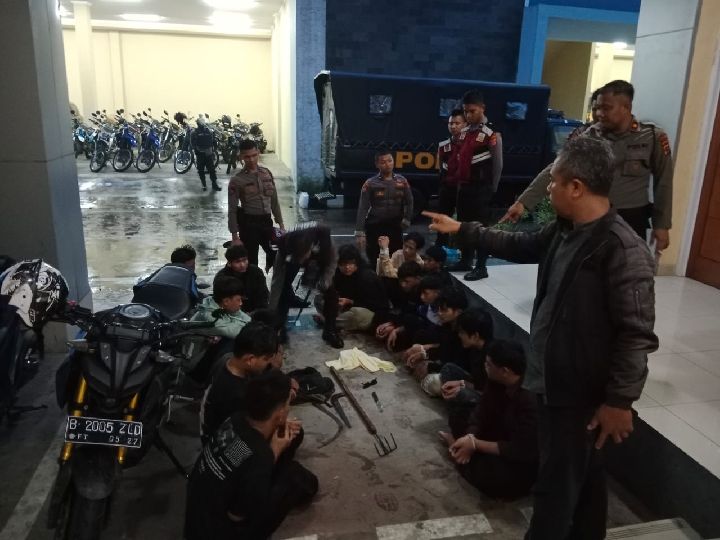 KABUPATEN TANGERANG – Personel Satuan Samapta Polresta Tangerang Polda Banten mengamankan 15 remaja diduga anggota berandalan bermotor yang hendak melakukan aksi tawuran di Cikupa, Kabupaten Tangerang pada Minggu (26/2/2023) dini hari.