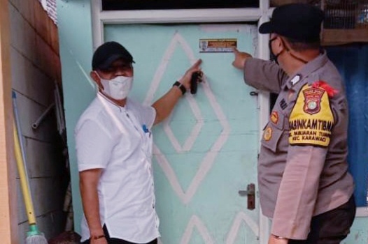 KOTA TANGERANG – Sebagai langkah untuk mengantisipasi penularan virus corona (Covid-19), jajaran Kepolisian Sektor Karawaci melakukan penempelan stiker imbauan di dinding maupun pintu rumah warga yang melakukan mudik lebaran pada saat Idul Fitri agar segera melakukan tes swab antigen. Imbauan itu bertuliskan Pastikan Kembali dari Mudik Dalam Keadaan Sehat, Wajib Swab Antigen/Karantina.