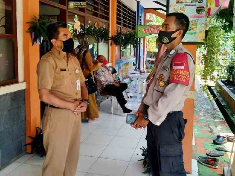 KABUPATEN TANGERANG – Bhayangkara Pembina Keamanan dan Ketertiban Masyarakat (Bhabinkamtibmas) Polsek Panongan-Polresta Tangerang, Aipda Robiana mengunjungi SDN Mekar Jaya di Kampung Ranca Kebo, Kecamatan Panongan, Kabupaten Tangerang, Rabu (24/11/2021).